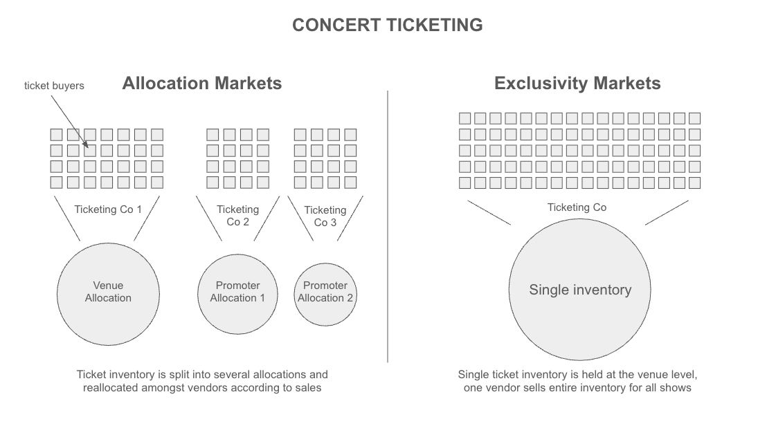 Then there’s the question of markets. In the UK (and many parts of Europe), ticketing is an allocation market. Multiple vendors might be selling tickets for the same show, each with a slice of the total inventory. The venue will typically want to sell a portion (usually around 50%), and the promoter will typically control the rest. Crucially, the promoter will often spread their allocation around multiple vendors in order to make use of the organic reach of each. That creates openings for new entrants: if you can persuade a promoter or artist to hand you an allocation because you have an audience, you can start selling immediately, even without exclusivity. It’s no coincidence that the larger standalone challengers of recent years, DICE and See Tickets, both originated from the UK.